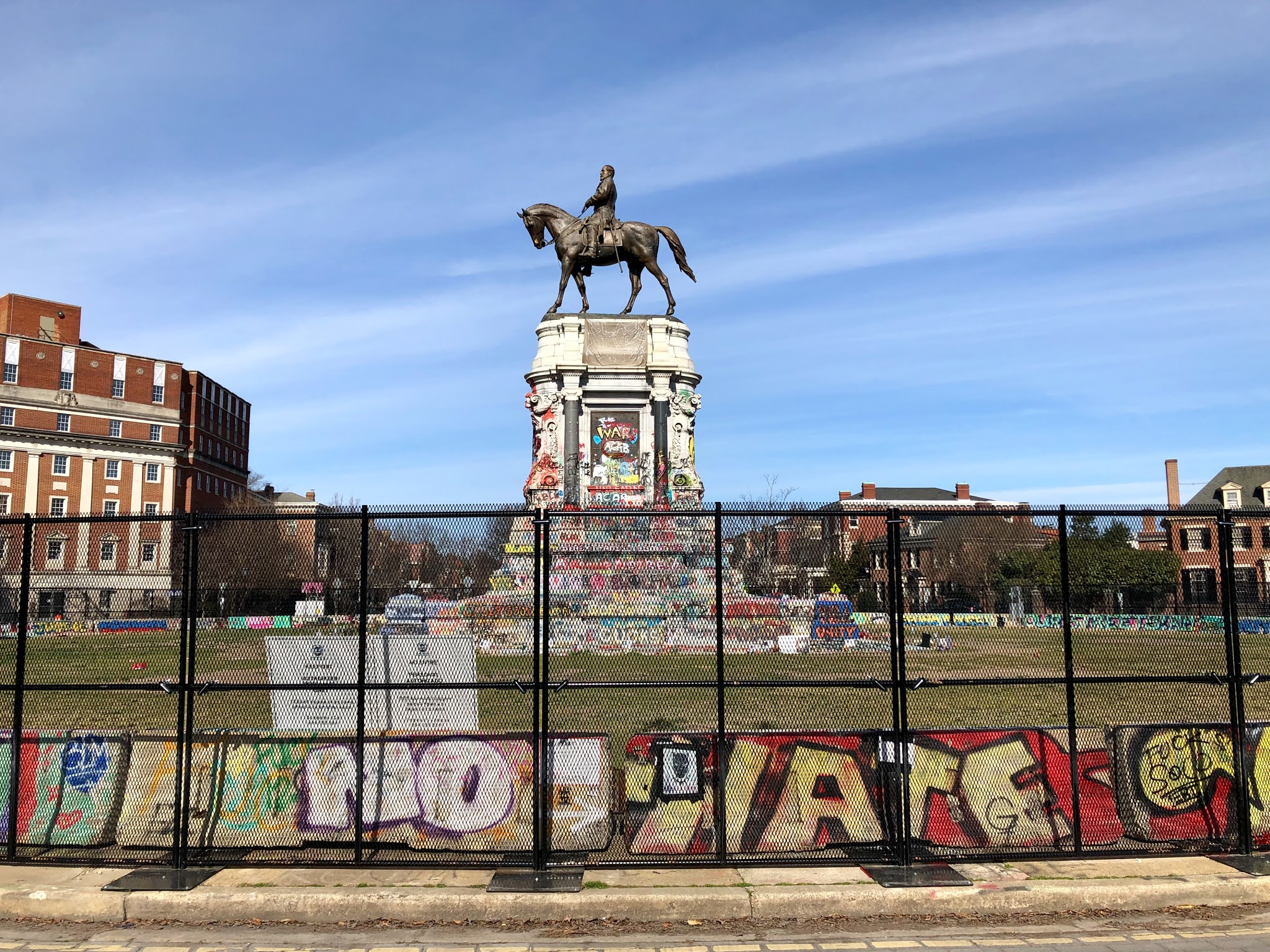 I'll be interested to see what happens in the near future to the Lee Memorial. How long will Richmond allow a vandalized, obscenity covered public monument to stay the way it is now? Will they actually take down the statue this summer? And if they do, will they use that opportunity to clean off the pedestal? Either way, will they continue to leave in place the concrete barriers, spray-painted or not, and the metal fence around the perimeter of the circle? Removing the graffiti or removing the pedestal entirely and re-purposing the circle might be more attractive, but erasing what's happened to something that never should have been there in the first place would be disappointing, I think. It's powerful the way it is. Remove the statue and erase what probably never should have been done in the first place but leave the rest please.